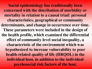 | A prospective study design was based on the longitudinal California Alameda County community health studies. HRQOL outcome was defined in the Moscow survey by life satisfaction, life happiness, self-rated health status, and the Alameda County Physical Health Profile, but only the distribution of physical health is reported here. |