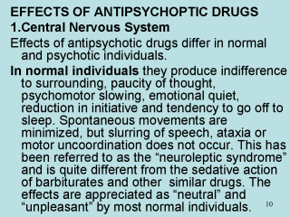 anxiety is relieved. Hyperactivity, hallucinations and delusions are suppressed. All phenothiazines, thioxanthenes and butyrophenones have the same antipsychotic efficacy, but potency differs in terms of equieffective doses. The aliphatic and piperidine side chain phenothizines (chlorpromazine, triflupromazine, thioridazine) have low potency, produce more sedation and cause greater potentiation of hypnotics, opioids etc. The sedative effect is produced immediately while antipsychotic effect takes weeks to develop. Moreover, tolerance develops to the sedative but not to the antipsychotic effect. Thus, the two appear to be independent action. Performance and intelligence are relatively unaffected but vigilance is impaired. Extrapyramidal motor disturbances initialy linked to the antipsychotic effect but are more prominent in the high potency compounds and least in thioridazine. The effects comprise acute dystonias and tardive dyskinesia. A predominance of lower frequency waves occurs in EEG and arousal response is dampened. However, no consistent effect on sleep architecture has been noted. The disturbed sleep pattern in a psychotic is normalised. |