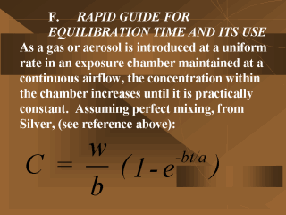 | C = Concentration in mg/liter at time t w = Milligrams of agent introduce/minute a = Volume of the Chamber in Liter b = Volume of air through the chamber in Liters/min e = The base of natural log, 2.7182 t = Time in min |