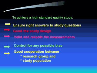 | To achieve a high standard quality study is to ensure right answers to the study questions. To achieve such a good study depends on how good the study design is which would reflect on how valid and reliable the measurement of exposure factors and outcomes of interest and how good the cooperation between the research group and the study population would be. |