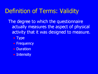 does the questionnaire measure what it is designed to measure?” - Validity implies that a comparison is made with a superior, although typically imperfect, standard. - A validation study can and should evaluate the questionnaire’s assessment of the type of activity. Examples of different activity types include recreational activity such as exercise, occupational activity, household activity, as well as childcare. - Validation studies should also assess the questionnaire’s assessment of frequency – how often the activity is performed, its duration – how long it is performed for each bout, as well as its intensity – the effort expended to conduct the activity. |