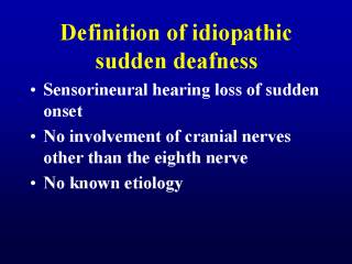 criteria for sudden deafness by Japan's Sudden Deafness Research Committee (1973) I) Main symptoms 1 Sudden onset of hearing loss 2 Sensorineural hearing loss, usually severe 3 Unknown etiology II) Accessory symptoms 1 May be accompanied by tinnitus 2 May be accompanied by vertigo, nausea, and/or vomiting, without recurrent episodes 3 No cranial nerve symptoms other than from the eighth nerve Definite: All of the above criteria (=>idiopathic sudden deafness) Probable: Main symptoms 1 and 2 Reference: Nomura Y. Acta Otolaryngol Suppl (Stockh) 1998;S456:7-8. |