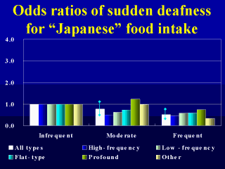 CI=0.33-0.82) as likely to be cases as people who infrequently consumed these foods. In hearing loss subgroups, people who frequently consumed Japanese foods were only about one-third (OR=0.34, 95% CI=0.12-0.95) as likely as those who infrequently consumed these foods to be cases with "other" hearing loss. In other four subgroups, people who frequently consumed Japanese foods had odds ratios less than one (ranging from 0.46 to 0.75), but again, the differences between these odds ratios and their respective reference groups were not statistically significant. |