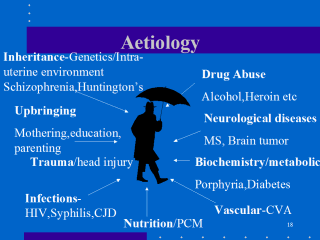 Infections -Syphilis, HIV Trauma-post head injury Neoplasms-Brain tumors may present with personality change and mental distress Genetics-Huntington’s chorea and dementia Vascular-post stroke or intermittent arterial embolism Drug abuse-Korsakoff’s psychosis in chronic alcoholics but often there is no obvious cause. |