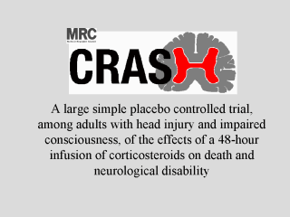 infusion of corticosteroids on death and neurological disability - It aims to recruit 20,000 patients world-wide - CRASH is an international multi-centre trial and has been funded by the UK Medical Research Council - Like all such trials it depends on strong collaboration. It will require the collaboration of hundreds of doctors and nurses internationally in order to be a success |