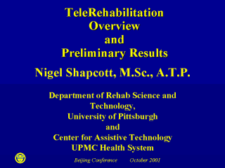 the main features and concepts that we currently understand about TeleRehabilitation. 1. Overview of Telemedicine and TeleRehabilitation 2. Technologies and nomenclature 3. Report on local findings 4. Future developments 5. Opportunity for interactive web based discussion |