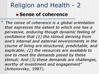 (See slide for details) Reference: Antonovsky, A. (1987). Unraveling the mystery of health: How people manage stress and stay well. 1st ed. San fransisco. Jossey-Bass Publishers Antonovsky, A. (1979). Health , Coping and Stress. 1st ed. 433 California street, San Fransisco, Califronia 94104. Jossey-Bass Inc. |
