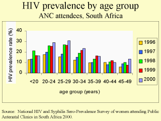 hovering close to an alarming 30%. The graph also shows that there are seemingly fewer teenagers contracting HIV in 2000 than in the previous two years. One possible explanation (as offered by the South African Department of Health) is behavioral changes such as increased condom use amongst adolescents, which is supported by studies documenting changes in condom usage. However, this trend in reduced prevalence is not sustained later in life, therefore although the lower prevalence in the under 20 age group is encouraging it indicates a delay rather than avoidance of the onset of HIV. If a similar graph was constructed for males, HIV prevalence would be highest amongst the 30 - 39 years age groups. |