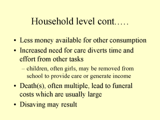 maintain income and labour. For example, households may buy cheaper foods, rely on wild foods, beg, or call in social and familial obligations (sending children to stay with relatives). Households might also borrow money from the informal sector or relatives, sell assets or use up savings or investments to maintain an income. Children, especially girl children, may be removed from school to alleviate labour shortages, the size of cultivated areas may be reduced or relatives might be asked to help (calling in social and familial obligations once again). Some of these responses are less than ideal, for example the removal of children from schools to alleviate labour shortages may have long term repercussions for the individuals involved, while constant reliance on social and familial obligations may cause these bonds to break down. Disaving refers to the use of savings or selling off household assets. |