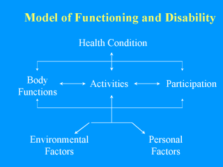 live in. To more clearly define this view, the World Health Assembly approved in 2001 the International Classification of Functioning, Disability and Health and its abbreviation of "ICF." This classification is the revision to the International Classification of Impairments, Disabilities, and Handicaps. The ICF is structured around the following broad components: Sources: http://www.who.int/classification/icf/intros/ICF-Eng-Intro.pdf |