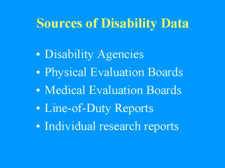 Disability-related data for service members in the Army, Navy and Marine Corps, and Air Force may be compiled from a number of sources. For example, information on the number of days lost to active duty from short-term health conditions is available through the service-specific medical branches or line-of-duty reports. Information on the number of persons discharged from service or temporarily released from duty with pay due to physical disability is available from independent disability agencies within each service. The specific agencies include the Army Physical Disablity Agency, the Naval Disability Evaluation Board, and the Air Force Physical Disability Division.