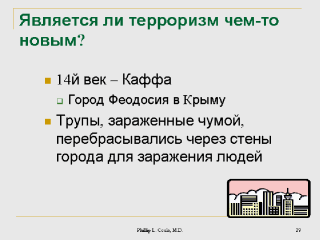 Всемирные акты биотерроризма не являются новинкой. Даже в 14 м веке, трупы людей, зараженных чумой, использовались как оружие.