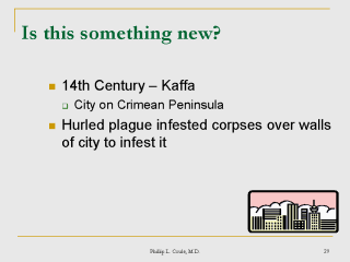 ago. Source: Chemical and Biological Terrorism, an overview of the threat. Phillip L. Coule, M.D. World-wide biologic warfare is not new. As early as the 14th century, plague infested corpses were used as weapons. |
