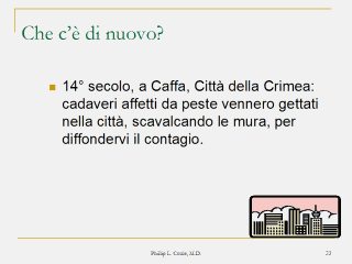 Phillip L. Coule, opera citata Chemical and Biological Terrorism, an overview of the threat. Phillip L. Coule, M.D. La guerra biologica non è una novità: fin dal 14° secolo, i cadaveri appestati erano usati come armi. |