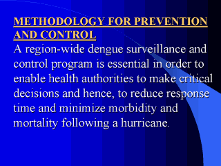 of control that is based on the actions outlined below: - The distribution of Aedes aegypti must be determined in all regions, especially in the urban areas; - The status of Aedes albopictus, a second very efficient vector should also be determined by intensifying surveillance programs to prevent the spread of this potential vector of dengue virus; - Emphasizing environmental management as the main vector control tool. The prudent use of insecticides should only be undertaken when physical methods are impractical and biological control methods should only be pursued if appropriate. The prudent use of insecticide should include both space spraying for rapid/temporary reduction of infected adult mosquitoes and source reduction for permanent control plus monitoring vector susceptibility to the insecticides to be used during these periods; - Continuing to monitor the vector population through appropriate statistical sampling procedures, in order to target control efforts and evaluate control interventions; - Encouraging and incorporating the community's full participation in the design, execution, and evaluation of prevention and control activities; - Developing a laboratory-based surveillance network within individual countries or among neighboring countries. Viral isolation capability also should be developed where possible; - Promoting the public health and medical education of health care personnel in the recognition, management, and treatment of dengue and dengue hemorrhagic fever/dengue shock syndrome; - Determining the important geographical epidemiologic, and socio-demographic risk factors for dengue, and stratifying the infested areas by level of risk, in order to efficiently utilize available resources; - Utilizing information systems that integrate all pertinent data on the vector, disease, and risk factors: to aid in decision-making, improve the program, and provide future direction for the program; and - Periodically evaluating the cost-efficiency and effectiveness of prevention and control programs as a basis for adjusting program strategies. |