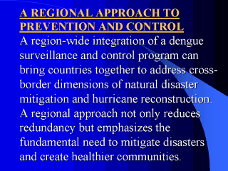 redundancy. This study endeavored to support a collaborative solution regarding a regional approach to a dengue prevention/control and surveillance program which will bring the nations of the region together as equal partners and build upon the assets, strengths, and capacities of each country. Also, to promote and encourage development of improved methods for surveillance and community-based prevention and control programs as well as the communication of the findings and implications through-out the region. However, collaboration must be inclusive to succeed in fostering the equitable exchange of knowledge and ideas between the nations of The Caribbean and Central America. |
