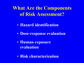 Hazard identification Every chemical has some intrinsic hazards; certain chemicals cause lung cancer and others cause kidney disease. Dose-response evaluation No matter how hazardous some thing is, there is no risk if there is no exposure. Risk is related to the dose-response curve. Human Exposure evaluation We need to understand level of exposure in human Risk characterization Once we have done the above three things, we have to be able to characterize the risk for policy maker and for public to make sense. |