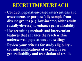 http://www.re-aim.org/ck_sip.html The goal of enhancing the Reach of an intervention is too have large samples of representative participants or careful description of recruitment, screening, and retention of participants to assess its potential generalizability. |