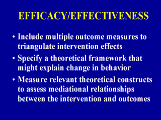 | The goal of this element is to design a robust intervention that will have a strong effect on behavior change and to gain an understanding of how and why it worked. Under study conditions, efficacy or effectiveness measures the success of an intervention when implemented as per intervention guidelines under optimal conditions or in real-world situations, respectively. |