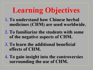 In order for students to appreciate these learning objectives more effectively, they will be given first a brief introduction of how Chinese herbs are used worldwide, including the basic definition of CHM.