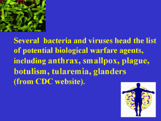 effectively with the threat of bioterrorism. This strategy includes anticipating how smallpox, anthrax,and the other agents might be used for such purposes; planning for diagnosis and consequence management at the local level; adopting measures to prevent panic among the general populace; and conducting the basic and applied research that is needed to address these complex issues. (http://www.asmusa.org/pasrc/pdfs/eidbriefing.pdf) Additional Resources: |