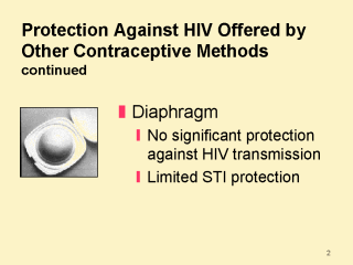 | The diaphragm has limited STI protection and no significant protection against HIV transmission. The fact that sexual transmission of HIV can occur in women who have had a hysterectomy shows that covering the cervix does not provide sufficient protection. |