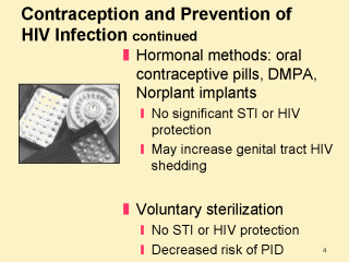 | Hormonal contraceptive methods offer no significant STI protection. There are some data, although inconclusive, that they may increase genital tract HIV shedding, as well as increase HIV susceptibility women not infected with HIV. Voluntary sterilization, although it may reduce the risk of acquiring tubal infection or salpingitis, does not offer other STI or HIV protection. |