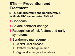 HIV are closely linked. First, both ulcerative and nonulcerative STIs increase the risk of HIV transmission 2-5 times and genital ulcers disrupt the epithelial barrier. STIs also increase the number of cells vulnerable to HIV in the genital tract, increasing susceptibility in uninfected individuals. On the other hand, HIV-infected persons with STIs have increased genital tract HIV viral load, which increases infectiousness. Therefore, prevention and treatment of STIs is another important component of HIV prevention. Indeed, in one clinical trial in Tanzania, treating STDs decreased HIV seroconversion by 38% over 2 years. The best way to prevent STIs is to reduce sexual risk behaviors and to use condoms consistently and correctly. Both men and women should be educated about personal risk factors and early symptoms of STIs. Another way to prevent HIV is to treat STDs as early as possible. In areas where laboratory facilities are not available, treatment of STIs is based on groups of symptoms and signs that may be explained by more than one condition. Treatment is given for all of the most likely STIs causing the syndrome, based on local epidemiologic data. The syndromic approach is quite effective for management of genital ulcers and urethral discharge, but is less useful in managing women with abnormal vaginal discharge because of decreased accuracy in the diagnosis and treatment of cervicitis. |