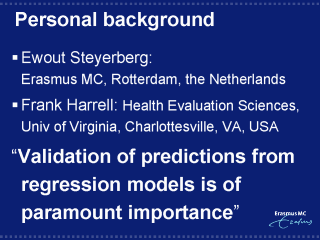 cost-effectiveness, prognostic factors and prediction. Frank Harrell is professor at the Department of Health Evaluation Sciences, University of Virginia, Charlottesville, VA, USA. He is an expert in predictive modeling and recently published a book on the topic (‘Regression Modeling Strategies’, Springer, 2001). Both have worked on predictive models for many years, and have recognized model validation as of paramount importance. It is well possible to develop a model with apparently provides adequate predictions, but fails when validated on new patient data. |