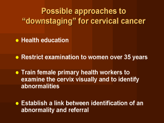 importance of early diagnosis for curability. In order to identify women in the target age group of 35-50 years in the community, a practical and effective mechanism must be devised. Female primary health workers should be trained to examine the cervix visually and to identify abnormalities. They should also be instructed on proper case finding and referral procedures. A link would be needed between identification of an abnormality and referral in order to be sure that all suspected lesions are properly diagnosed and treated, and that women receive proper follow-up. An information system will also need to be established to allow for monitoring and evaluation of the program, including measurement of the downstaging phenomenon. |