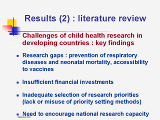 respiratory diseases, the prevention of neonatal mortality, the accessibility of vaccines. Among the reasons explaining these gaps in research is the lack of resources dedicated to research: more than 11% of the global burden of disease is due to respiratory and diarrhoeal diseases (are much more than that in child burden of disease), but only 0.2% of the total spending on research is allocated to these conditions. Among the factors explaining research policies that are inadapted to the health needs of children in developing countries, firstly the inadequate use of research priorities method, the selection criteria not always being based on the evidence. Furthermore, the fact that the potential of research to improve child health is underexplored because of the difficulties developing countries face to engage their own research initiatives which could maximise the likelihood of the implementation of reseach results. |