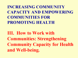 and the Part II of this lecure? The mechanisms for strengthening communities are based always on the basic principles of respect for community values, knowledge, culture and decisions. The input of community leadership is essential to the whole process, and cannot be left exclusively to the technical staff. There is an overwhelming amount of literature on the subject of community participation, which can provide a great deal of useful and practical approaches and skills to develop community participatory processes in health. In this section we will briefly summarize some of the mechanisms and practices that facilitate CC building to achieve broad health objectives. Ultimately what is important is that communities acquire the skills to negotiate health matters and participate actively in decision-making processes. As it was already mentioned, community participation cannot occur in a vacuum, it is nourished by common problems and issues that affect people's lives This is the key for "how" to make communities get involved and develop their own capacity. Whatever techniques (e.g., focus groups, Delphi, consensus-development, participatory planning, logic- framework, etc.) are used to stimulate community participation, the focus to be maintained is the assessment of the situation and prioritization of needs and problems made by the citizens . The exercise of identification of problems and needs is the best starting point for CC building, and the goal is to have the participation of those who have never had the opportunity of being heard. Health administrators, leaders and politicians should listen to the problems identified by the community in order to gain the trust and confidence of the communities. |