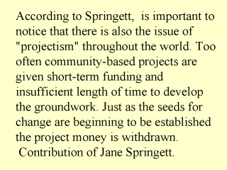 | So a proliferation of small projects that never come together to form a coherent whole is the result. Therefore effective work is unachievable. On the other hand small-scale projects are required to change the world and the pattern of disease when inappropriate criteria of evaluation are placed on them. |