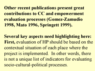 important. Third, there is general agreement that evaluation should be both quantitative and qualitative. Several authors stress that qualitative indicators are very important and need to be developed according to the context. The traditional quantitative health indicators, like morbidity and mortality, are too limited to measure community involvement in the solution of health problems and social support building. Evaluative processes should focus on the “why and how “ and not only on the “what and how many”. Fourth, evaluation of community processes require multidisciplinary or trans-disciplinary approaches. This means that disciplines need to develop a common framework for explaining problems and solutions in order to adjust their measuring methods. Fifth, participatory processes should be sustainable. It is important to search for indicators of sustainability in CC and empowerment. |