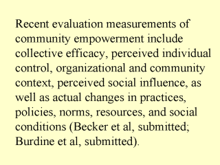 | Despite the goals of identifying standard measurements for capacity and empowerment, contextual and qualitative assessment must always accompany these processes. Each community has its own facilitators and barriers to change, which are critically important to understand if the goal is to develop community capacity. |