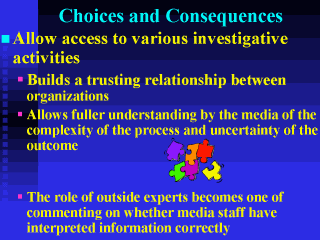 Once media are allowed access they are bound by the implied agreement that any breech of conduct on their part (such as revealing confidential information (more about that later)) will result in cut off of access. This restricted access will place them at a disadvantage to their competitors. Observation of investigative activities will result in a greater understanding of the complexity of the process. It is impossible to succinctly explain the complexities of an outbreak investigation to those without scientific background. Observation may not develop profound understanding but it will bring home the point that the process is one of putting together a puzzle. When media staff go to experts, they are more likely to ask whether they have understood what has gone on correctly because there is little left to speculate about. |