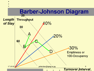 of the beds in a unit at times A, B, C and D: A - long length of stay,short turnover interval, throughput 29, high occupancy of > 90% Comment: Beds quite well used, but a long stay and admissions may be difficult. B - shorter length of stay, shorter turnover interval, very high throughput and occupancy > 90% Comment:Very efficient, staff would be exhausted and difficulties with admissions. C - increased length of stay, increased turnover interval ++, reduced throughput of 25 and occupancy about 85% Comment: Possible reaction to C, admissions easier. D - much increased length of stay,much increased turnover interval, throughput 22, occupancy 74% Comment: Inefficient use of beds. |
