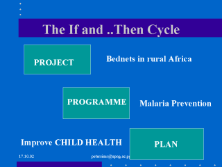 there will be agreed indicators: Project: No. of nets given out No. of nets in use at 1/12,3/12 and 6/12 Programme: Cases of malaria in Under Fives Surveys for parasitaemia Plan: Prevalence of Malnutrition Under five mortality |