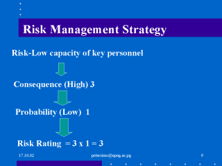 components. E.g. Funding streams Availability of skilled personnel Support by the local community Supply problems A Risk Rating can be attached to each and then a suitable Risk strategy to contain that Risk. |