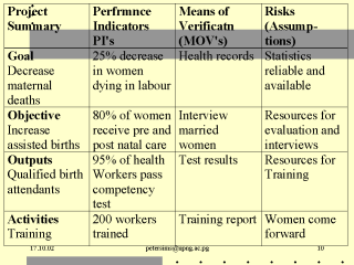 deliveries. These women will have sufficient training to maximize cleanliness, to use a sterile blade to cut the cord and give an oxytocic preparation to minimize bleeding in the third stage. They will also know how and when to call for help. There may be problems in gauging the success of the project as records are poorly kept and often unavailable. It is difficult to get funds for even simple evaluation. The sustainability of the project will depend upon continuing to motivate, train and pay women for this task and an appreciation of their role by the village women. |