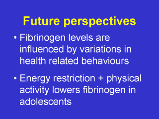 factors in the Whitehall II study. Atherosclerosis 1993; 102(2):195-207. Meade TW, Chakrabarti R, Haines AP, North WR, Stirling Y. Characteristics affecting fibrinolytic activity and plasma fibrinogen concentrations. BMJ 1979; 1(6157):153-156. Gallistl S, Sudi KM, Cvirn G, Muntean W, Borkenstein M. Effects of short-term energy restriction and physical training on haemostatic risk factors for coronary heart disease in obese children and adolescents. Int J Obes Relat Metab Disord 2001; 25(4):529-532. |