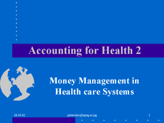 | Did you see the Part I of this lecture? To understand the complexities of Planning in Health it is useful to have a working knowledge of the vocabulary of both the accountant and the economist. It is important to be able to read a balance sheet and appreciate the implications of over and underspending, of cash flow and of clinical budgeting. |