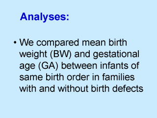 | We compared mean birth weight in grams and gestational age in days between infants of same birth order in families with and without birth defects. Gestational age data were screened for birth weight – gestational age consistency using a method based on the assumption of normally distributed birth weights for each gestational week (Skjaerven R et al. New standards for birth weight by gestational age using family data. Am J Obstet Gynecol 2000; 183: 689-96). |