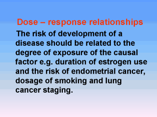 | An observed dose-response relationship strengthens a causal hypothesis. Dosage and duration are often interchanged in study design, and both may cause a gradient in disease frequency. People with longer exposure time may have a greater time period in which to develop the disease. |