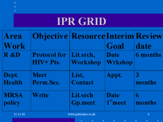 a Clinician identifies three objectives: 1) In R & D where the task is to develop a protocol in the hospital for the best care of HIV patients during surgery. It will be necessary to do a literature search and hold a workshop with the key clinicians. It is hoped that an agreed protocol will be ready within 6 months. 2) Administrative-to see the new Permanent Secretary for Health and make the Civil servant and in turn the Minister aware of the particular difficulties this hospital faces, the possible solutions and the implications for budgets, waiting lists and education. This should be achieved within 3 months. 3) To write an MRSA policy for the Hospital. This will require setting up a Working Group, chairing it and proceeding to an agreed written document within 6 months. |