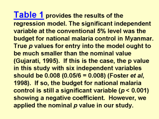 Holding other things constant, in the sample period, a decreased budget of kyats 1,000,000 (US$ 1.0 = Kyats 6.3, official exchange rate) (International Monetary Fund, 1999) was, on the average, followed by an increase of about 2340 new malaria cases.
