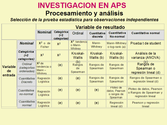 (a) Si se censuran los datos. (b) La prueba de Kruskal-Wallis se usa para comparar variables ordinales o no normales para más de dos grupos, y es una generalización de la prueba de U de Mann-Whitney. (c) El an álisis de la varianza (ANOVA) es una técnica general, y una versión (ANOVA de una vía) se usa para comparar las variables distribuidas normalmente para más de dos grupos, y es el equivalente paramétrico de la prueba de Kruskal-Wallis.(d) Si la variable resultado es la dependiente, entonces los residuos ser án verosímilmente normal, entonces la distribución de la variable independiente no es importante.(e) Hay varias t écnicas más avanzadas, como la regresión de Poisson, por tratar con estas situaciones, pero requieren ciertas asunciones y es a menudo más fácil o dicotomizar la variable resultado o tratarla como continua. |