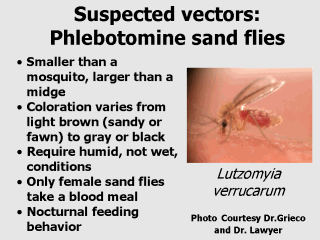 MORPHOLOGY - Smaller than a mosquito, larger than a midge - Delicate, with long slender legs - Distinguished by the way they hold their pointed wings in a “V” above their body - Require humid, not wet, conditions - Only female sand flies take a blood meal - Males feed on plant juices and nectar - Mainly in tropics and subtropics FEEDING BEHAVIOR - Nocturnal unless disturbed - During periods of minimal air movement - Only females take blood - Both males and females require carbohydrates (sugar) for energy (daily?) - Painful bite |