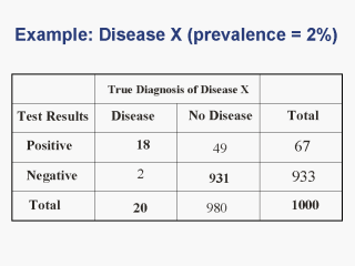 (1,000 x 0.02 = 20) Sensitivity = 18/20 = 90% Specificity = 931/980 = 95% Positive Predictive Value = 18/67 = 27% Negative Predictive Value = 931/933 = 99.8% |