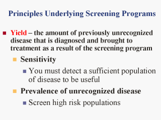 screening - Screening on a one time basis does not allow for the natural history of the disease, differences in individual risk, or differences in onset - Diseases have lead time Participation and follow-up- Tests unacceptable to those targeted for screening will not be utilized |